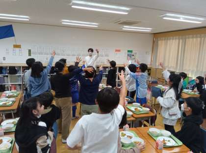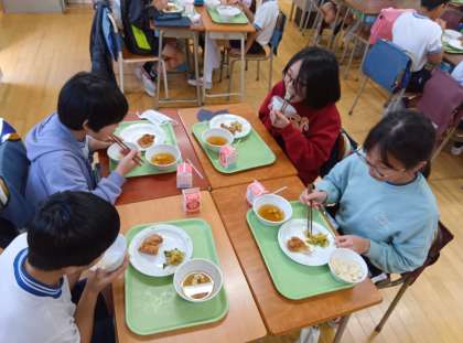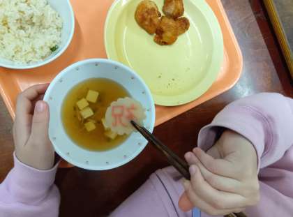 給食の時間です。今日は開校記念お祝い給食です。めでたい鯛めしとお祝い汁など、みんなで美味しくお祝いしました。