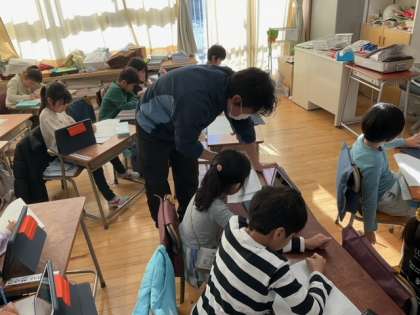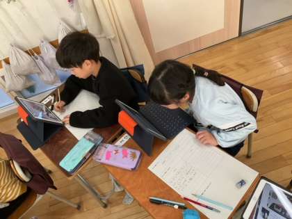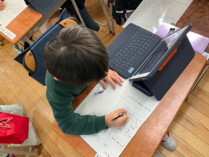 国語の時間です。これまでの学習を発展させて、自動車図鑑を作っています。