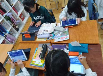 社会の時間です。日本の工業製品の発展のために努力しているすがたを調べ、プレゼンをする準備をします。