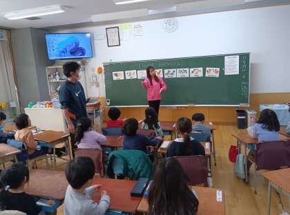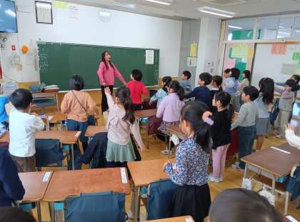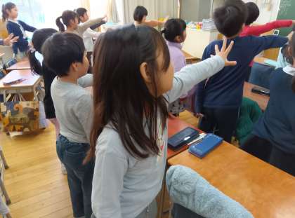 外国語の時間です。体を動かしながら英語を使いました。また、動物の鳴き声を真似したり、動物の言い方を英語で練習したりしました。