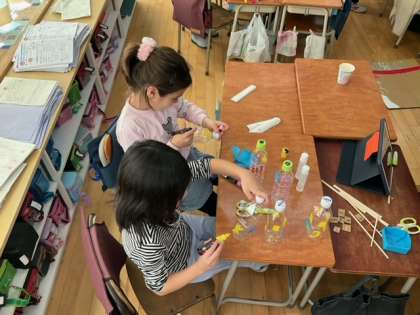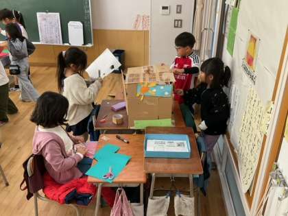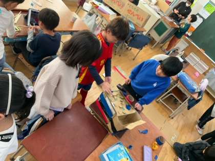 生活科の時間です。おもちゃづくりが進行中です。「校長先生、見て、見て」楽しそうです!