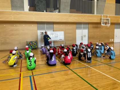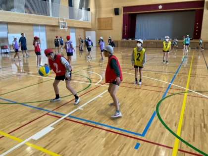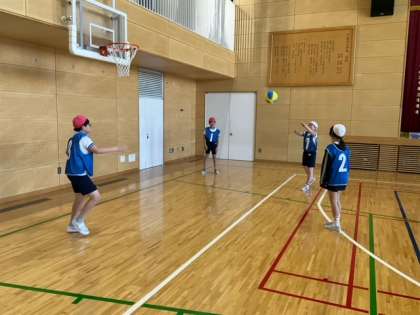 体育の時間です。バスケットボールが始まりました。柔らかいけど、しっかりとはずむ、いいボールが開発されています。
