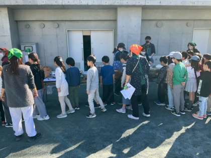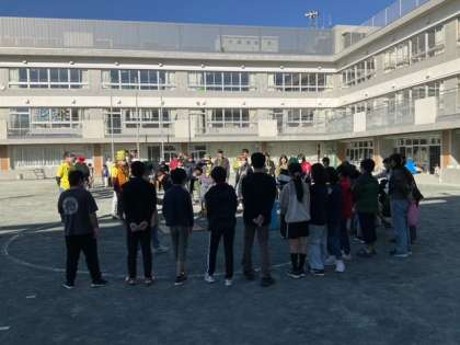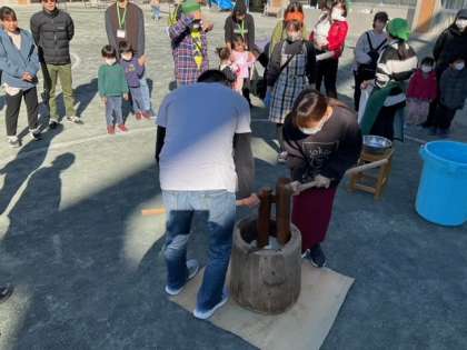 さあ、おもちつきがスタートします。先生たちもがんばっています。