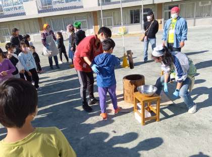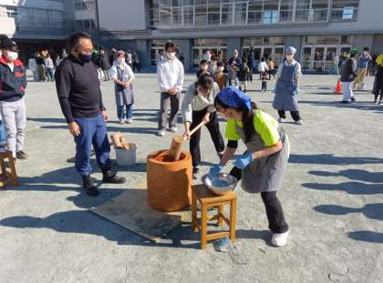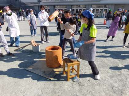 杵は重いけど、大人の手も借りながら一生懸命つきました。自分でついたおもちはおいしそうです。