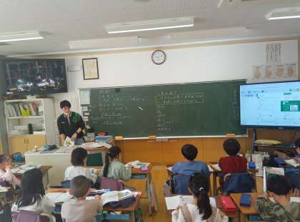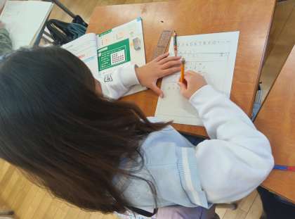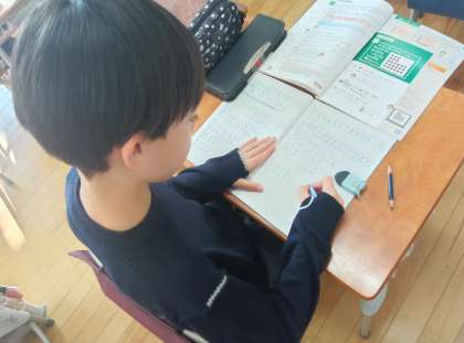 算数の時間です。○倍の長さをテープ図とかけ算で表しました。良い姿勢でノートを書いていました。