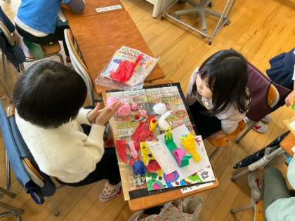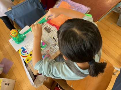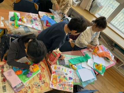 図工の時間です。「くしゃくしゃ だいへんしん」丸めたり、ちぎったりしたものを組み合わせ、イメージを広げながら作品を作っています。