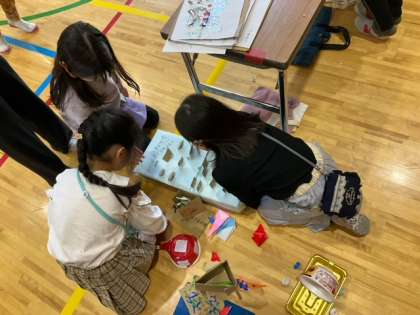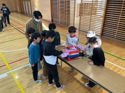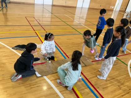 生活科の時間です。「自分たちで作った おもちゃであそぼう」楽しそうです。盛り上がっています。