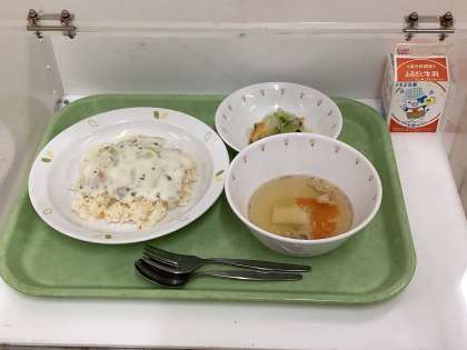 エビクリームライス コールスローサラダ コンソメスープ 牛乳