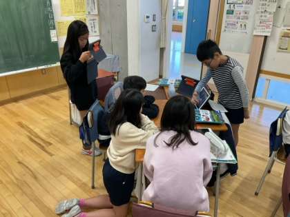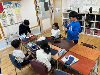 社会科の時間です。日本の工業について学習を進めてきました。発表会を行っています。