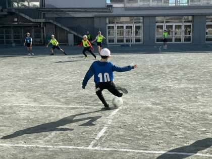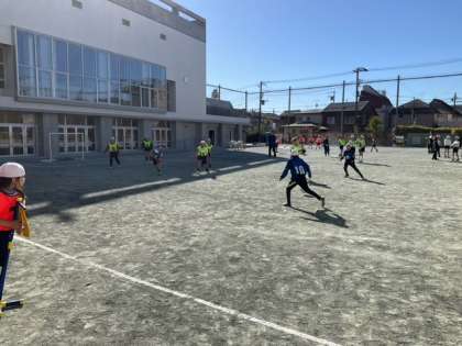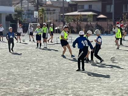 体育の時間です。サッカーのゲームに取り組んでいます。よく声が出ていますね。