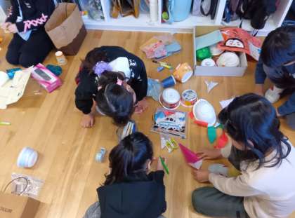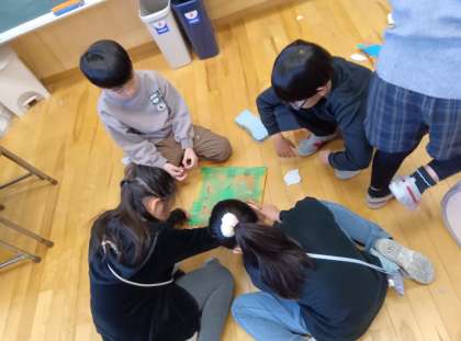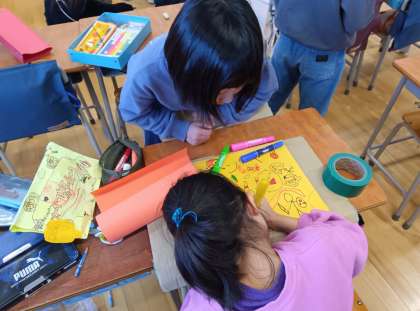 生活科の時間です。おもちゃのお店やさんを他クラスと一緒に行うために準備をしています。