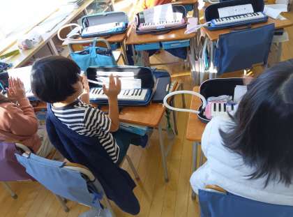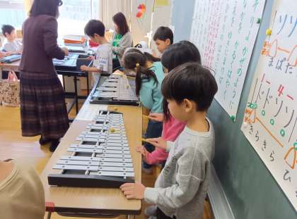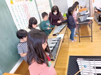 音楽の時間です。グループごとにきらきら星を鉄琴で弾きました。いい音が響いていました。