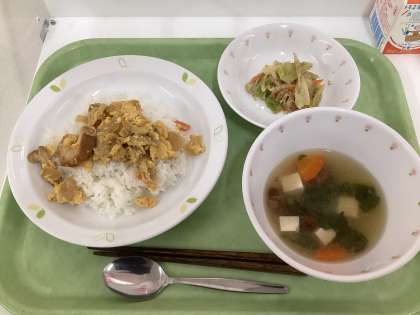 油麩丼 野菜の胡麻味噌和え みぞれ汁 牛乳