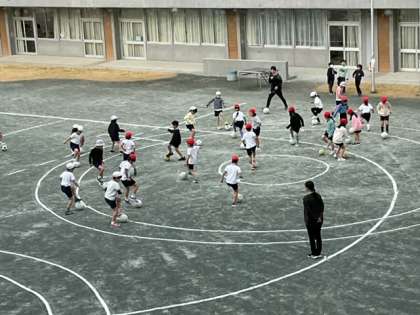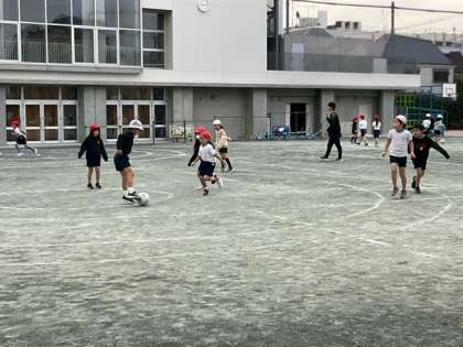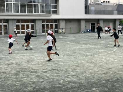 体育の時間です。ボールに慣れたあとは、ゲームに挑戦しています。
