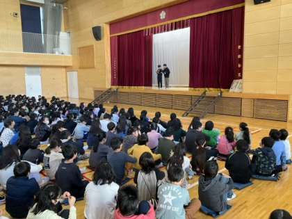 今朝の児童集会は、「先生の声当てゲーム」です。わかるかな?