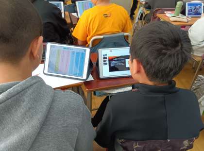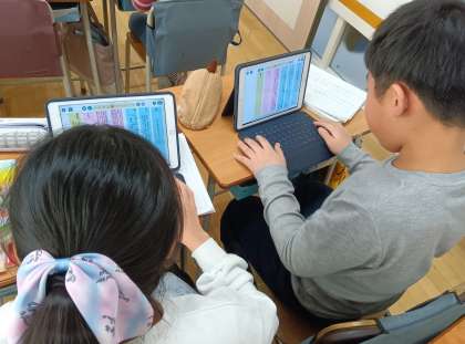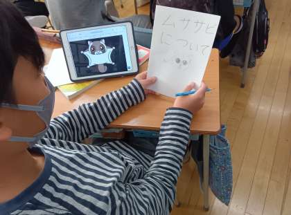 国語の時間です。おすすめのパンフレットを作っています。ロイロノートのワークシートに組み立てを考えて、パンフレットを作っています。おすすめな理由がよくわかるように考えています。