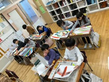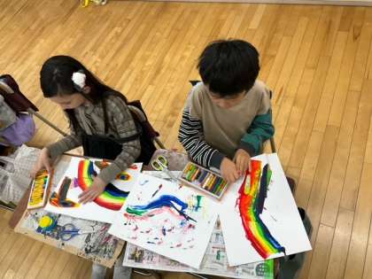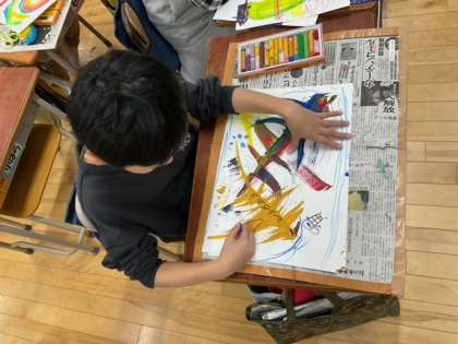 図工の時間です。「えのぐ ひっぱ レインボー」付け足したり、組み合わせたり、どんどん楽しい絵になりますね。