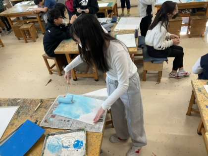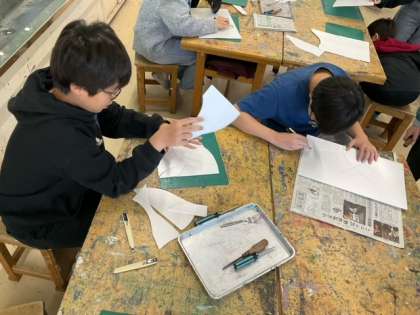 図工の時間です。「スチレンボード版画」うすい発泡スチロールを材料に、自由な発想で作品を作っていきます。