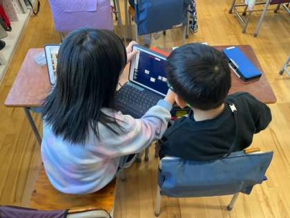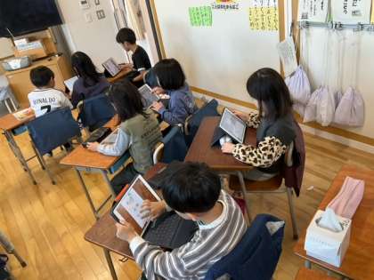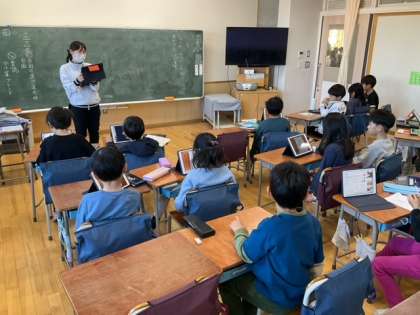 国語の時間です。ロイロノートに提出した各自の作品を見ながら、おすすめの本を紹介しています。