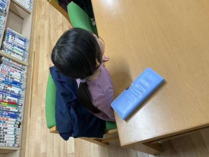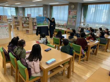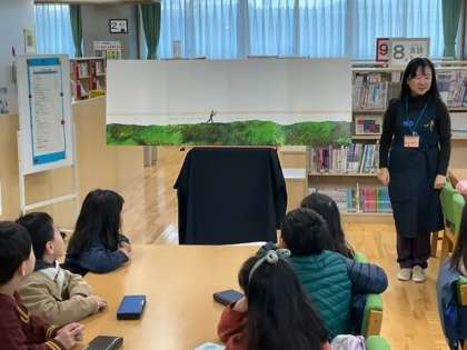 読書の時間です。司書の先生が、大きな大きな絵本を読んでくれています。