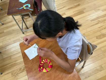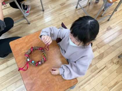 生活単元の時間です。飾りを工夫して、クリスマスリースを作っています。