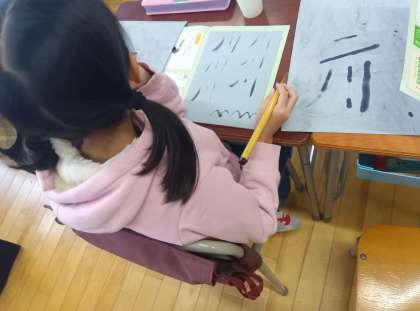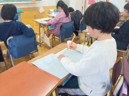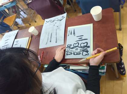書写の時間です。教科書に綴じてある水墨画シートを使って文字を書きました。