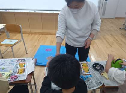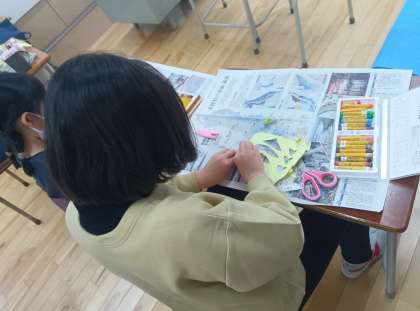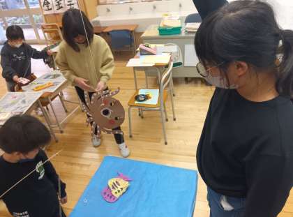 図工の時間です。画用紙で魚を作って、魚釣りをしました。穴を開ける場所や大きさに工夫がありました。