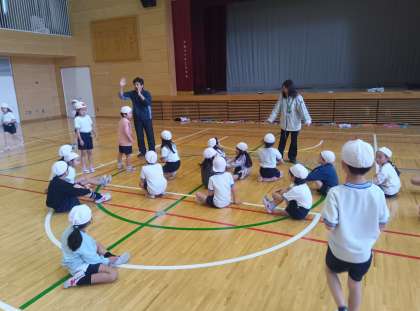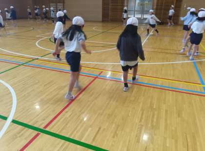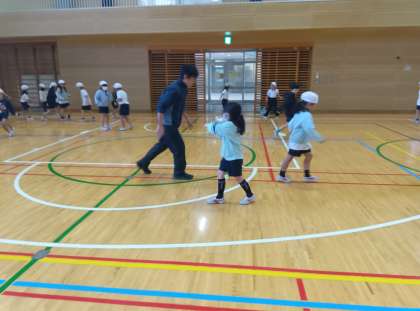 体育の時間です。ラインだけを使って鬼ごっこをしました。先生が鬼になって、みんな大喜びで逃げました。