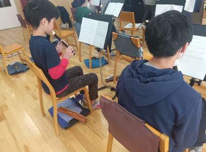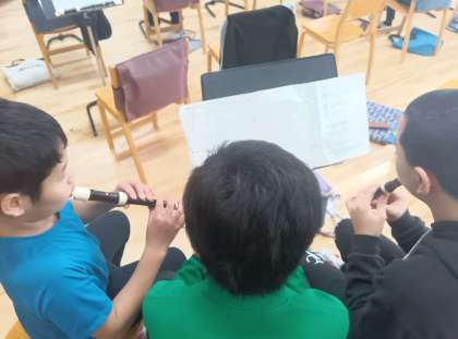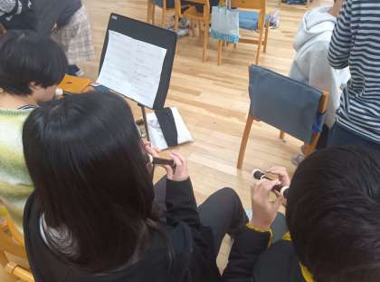 音楽の時間です。先生が用意してくれた楽譜から選んで吹きました。友達と合わせて吹いたり教え合ったりできました。