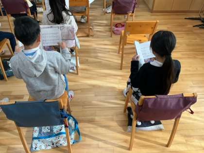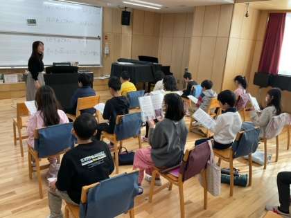 音楽の時間です。「もみじ」旋律の重なり合いや響きの美しさを感じながら、2部合唱をしています。