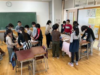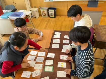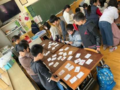 学級活動の時間です。手づくりカルタで、熱戦が繰り広げられています。