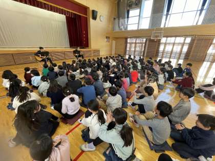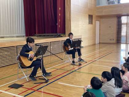 学年集会の時間です。3学期の生活の仕方や6年生を送る会に向けての話がありました。6年生を送る会で歌う歌を先生が歌いました。ギターをもって歌う先生方にびっくり、でも、とねも嬉しそうに聞いてました。
