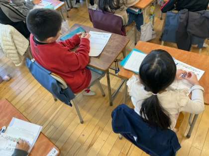 学級活動の時間です。「3学期 がんばるぞ!」一人一人がカードに書き込んでいきます。