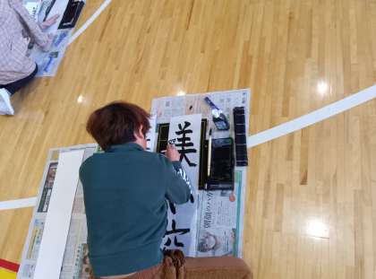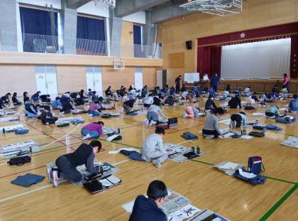 国語の時間です。「書き初め会」の風景です。4年生の題字は、「美しい空」です。
