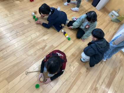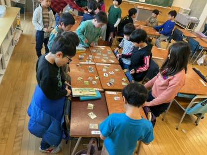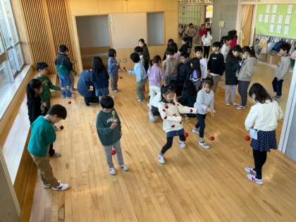 生活科の時間です。けん玉やだるま落とし、カルタなど、日本のあそびを経験しています。