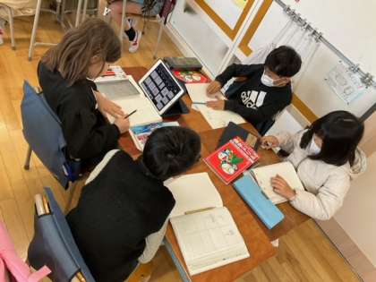 国語の時間です。「四枚の絵を使って」説明なしで、四枚の絵を使ったオリジナルストーリーを伝えてみよう。