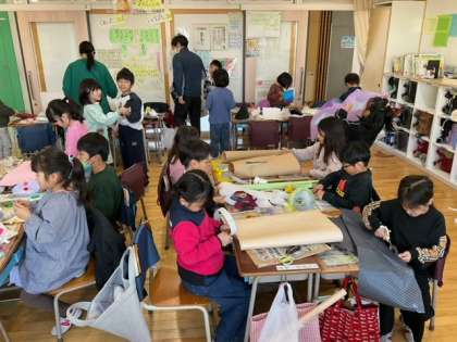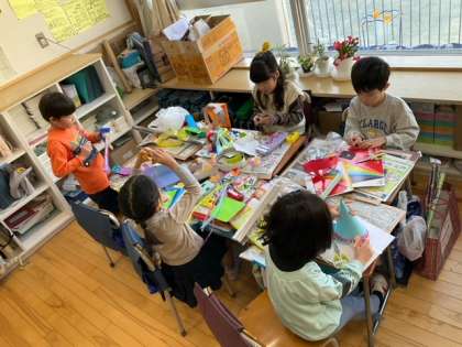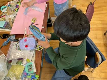 図工の時間です。「つくって へんしん」完成したら、ファッションショーをしましょうね。