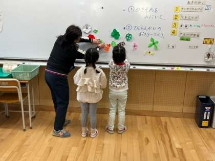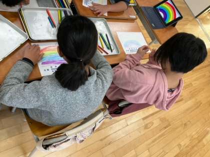 生活単元の時間です。連合展覧会に向けて、ポスターづくりなどに取り組んでいます。