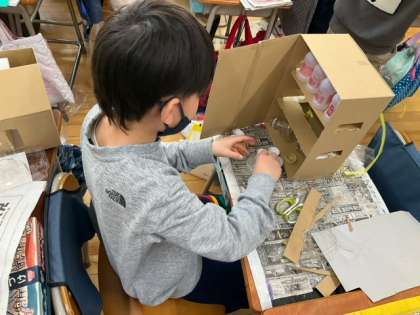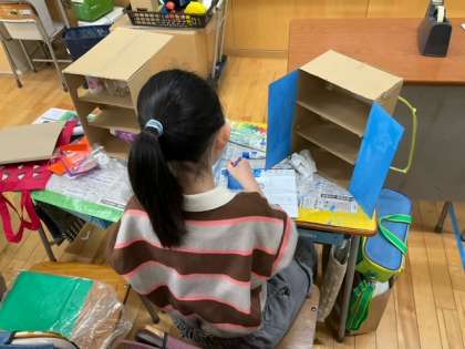 図工の時間です。「わくわくスーパーランドセル」こんなランドセルがあったら、とても楽しいですね。
