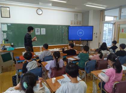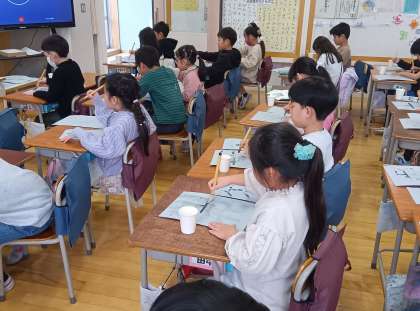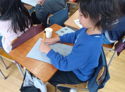 書写の時間です。筆を使って、いろいろな漢字を書きました。筆の使い方を練習しました。