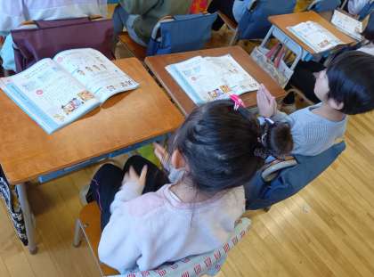 音楽の時間です。わらべうたを聞いたり、歌ったりしました。わらべうたを使った遊び方も知りました。