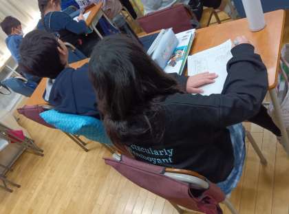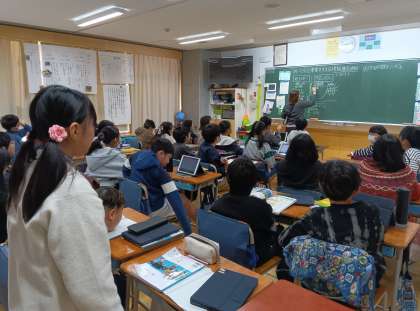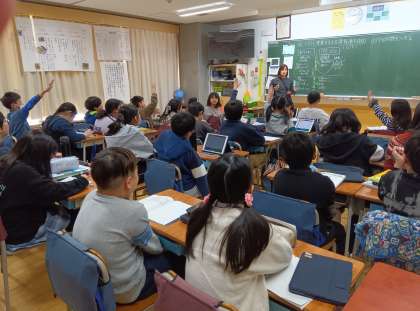 社会の時間です。お店などでどのように情報技術が活用されているか予想を出し合いました。