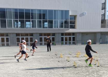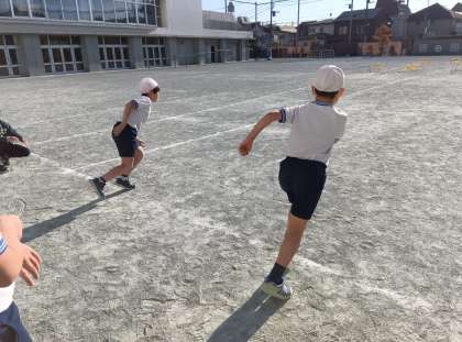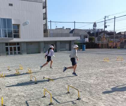 3年生は今日から金曜日6時間授業です。体育で小型ハードル走をしました。リズミカルに小型ハードルを越えていきました。