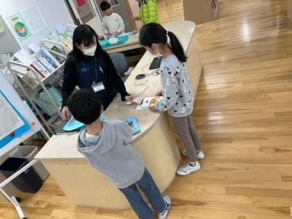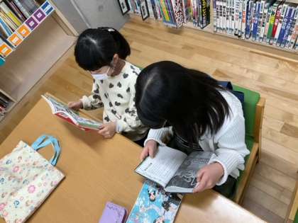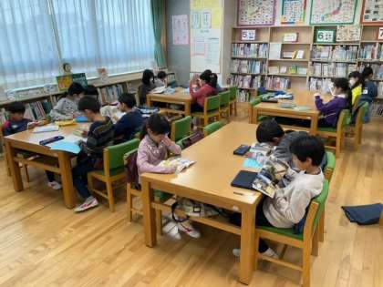 読書の時間です。下北沢小学校の図書室では、月ごとに特設展示が変わります。