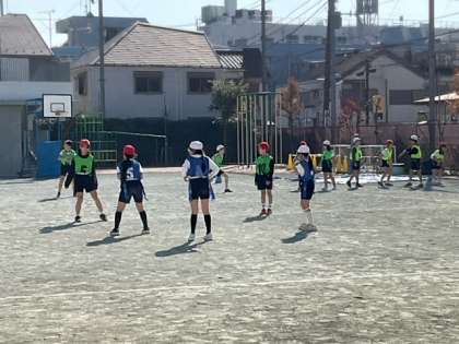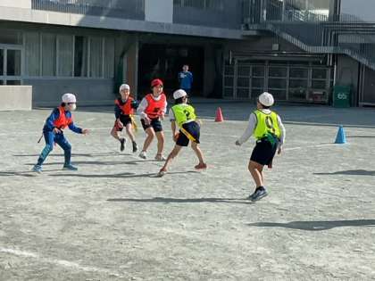 体育の時間です。タグラグビーが始まっています。相手の隙をついて、攻め込んでいますね。