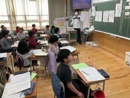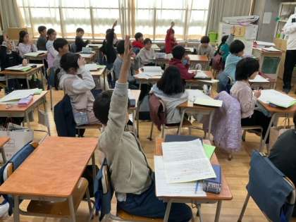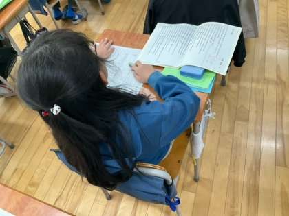 国語の時間です。「ありの行列」「中」の段落の文章の書かれ方について確認しています。