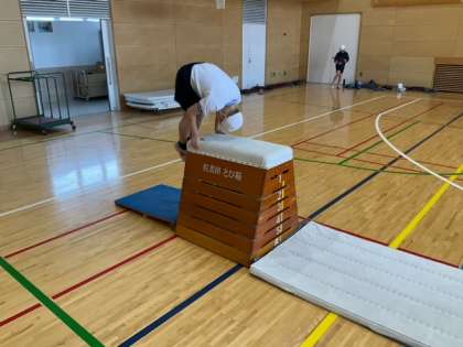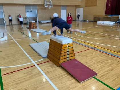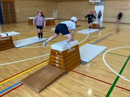 体育の時間です。「跳び箱運動」に取り組んでいます。いまの自分の力を確かめています。