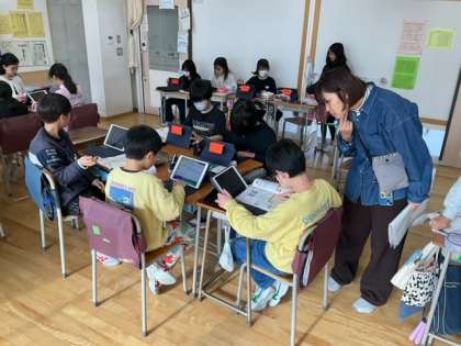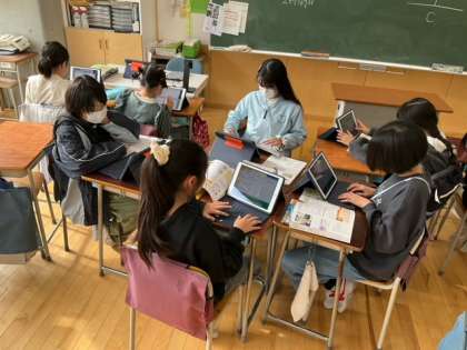 社会科の時間です。「くらしと産業を支える情報通信技術」テーマごとに分かれて、情報を共有しながら学習を進めています。