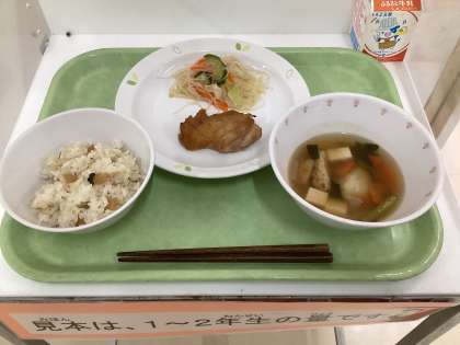 大根めし 鶏肉の味噌焼き 春雨サラダ すいとん 牛乳