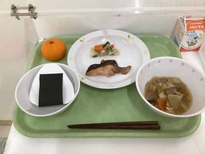 セルフおにぎり 鮭の塩焼き かぶの浅漬け 具沢山味噌汁 みかん 牛乳